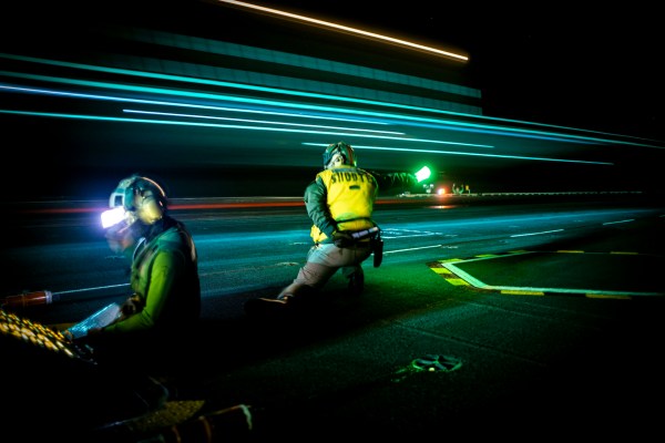 Lt. Elliot Reed, right, assigned to Air Department aboard the world’s largest aircraft carrier, USS Gerald R. Ford (CVN 78), signals to a Carrier Air Wing 8 F/A-18E Super Hornet, attached to Strike Fighter Squadron 87, as it launches from the flight deck, July 14, 2025. (U.S. Navy photo by Mass Communication Specialist 2nd Class Tajh Payne)