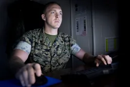 U.S. Marine Corps Cpl. Shelton Armstrong, a Robertsdale, Alabama native and a maintenance management chief with 2d Battalion, 2d Marine Regiment, 2d Marine Division, works on his computer on Marine Base Camp Lejeune, North Carolina, Oct. 1, 2024. (U.S. Marine Corps photo by Lance Cpl. Brian Bolin Jr.)